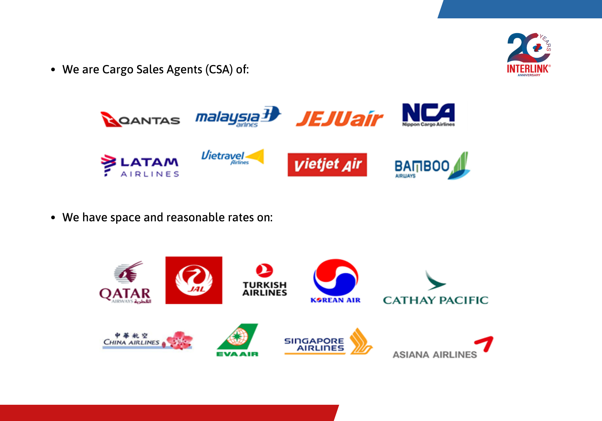 Interlink là CSA (Cargo Sales Agent) của một số hãng hàng không uy tín trên thế giới, luôn có giá cước cạnh tranh và đảm bảo chỗ cho khách hàng vào các mùa cao điểm.