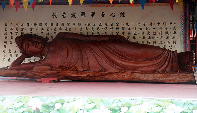 Tượng Đức Phật Thích Ca nhập niết bàn tạc bằng gỗ lũa nguyên khối đặt tại chùa Thắng Phúc (xã Tiên Thắng, huyện Tiên Lãng, TP Hải Phòng)
